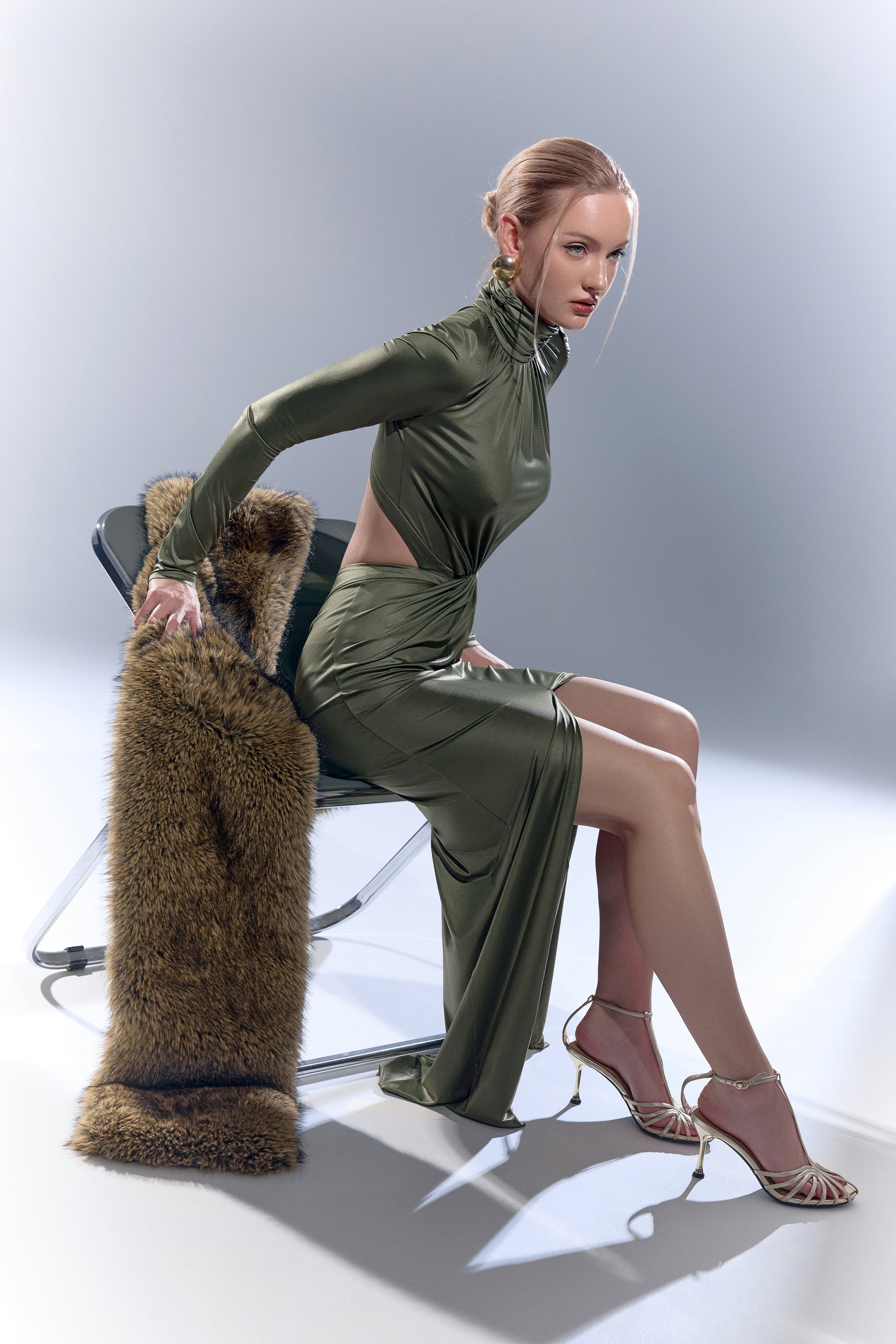 This elegant evening dress, crafted from a dense, stretchy fabric, perfectly accentuates the silhouette. The high-necked design with long sleeves creates a sophisticated, graphic look. The striking draping at the waist creates a striking accent and visually elongates the figure, while the bold front slit adds a touch of sensuality. The open back with a sculpted neckline and center zipper adds a modern, sexy touch.