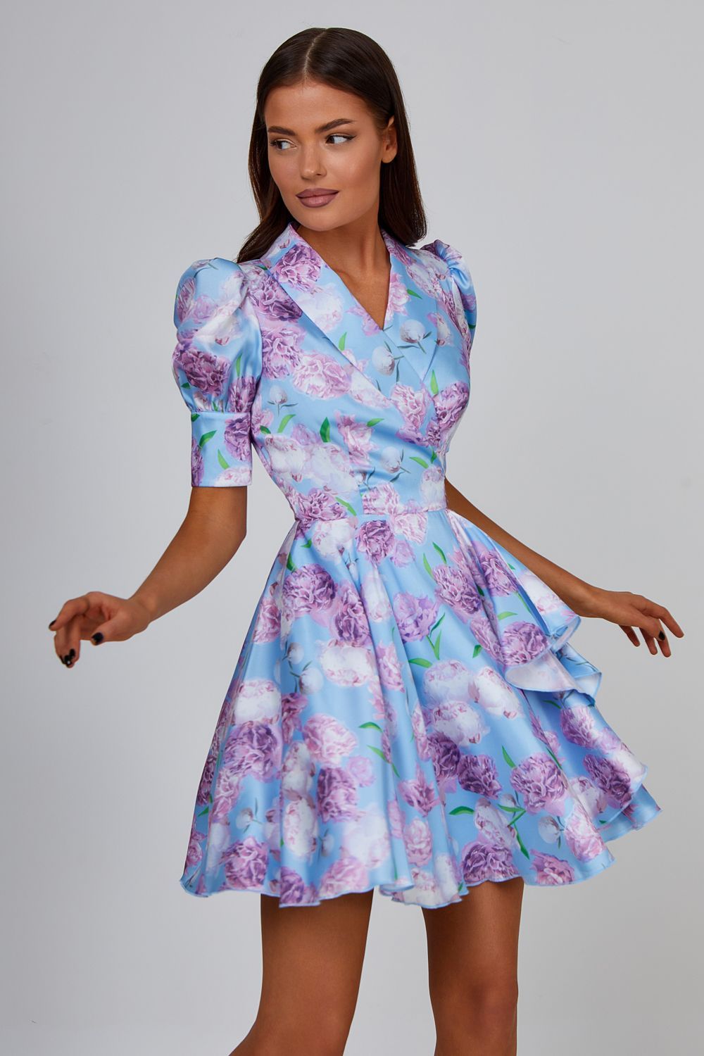 Mini wrap dress with puffed sleeves and turn-down collar. 100% Polyester. Lining: 97% polyester, 3% elastane.