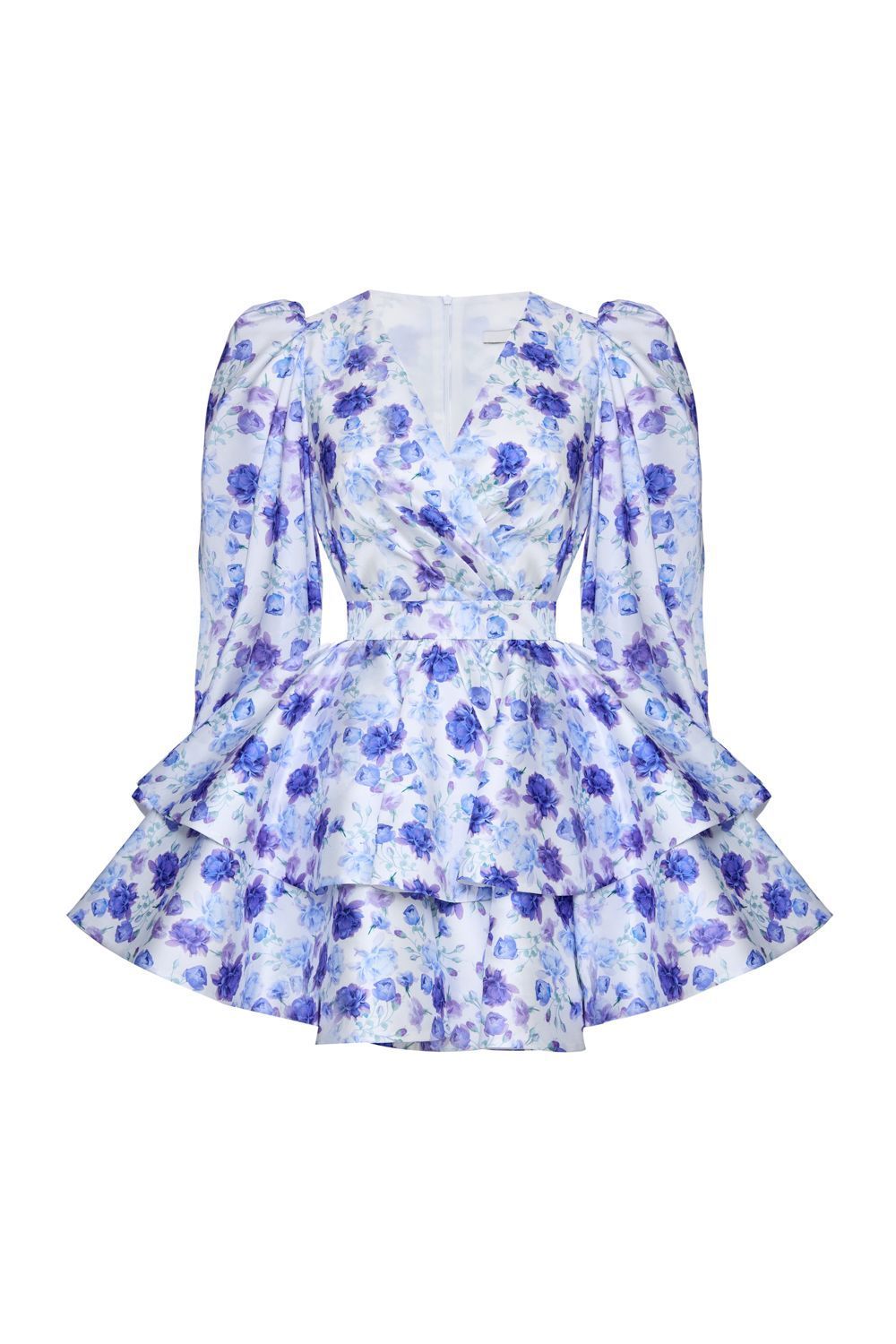 Air dress is mini with frills, long sleeve and a sewn belt at the waist. Made of flowing fabric with an author's print. Length on the back of 76 cm, sleeves 73 cm. Composition: 100% polyester, lining 97% polyester, 3% elast