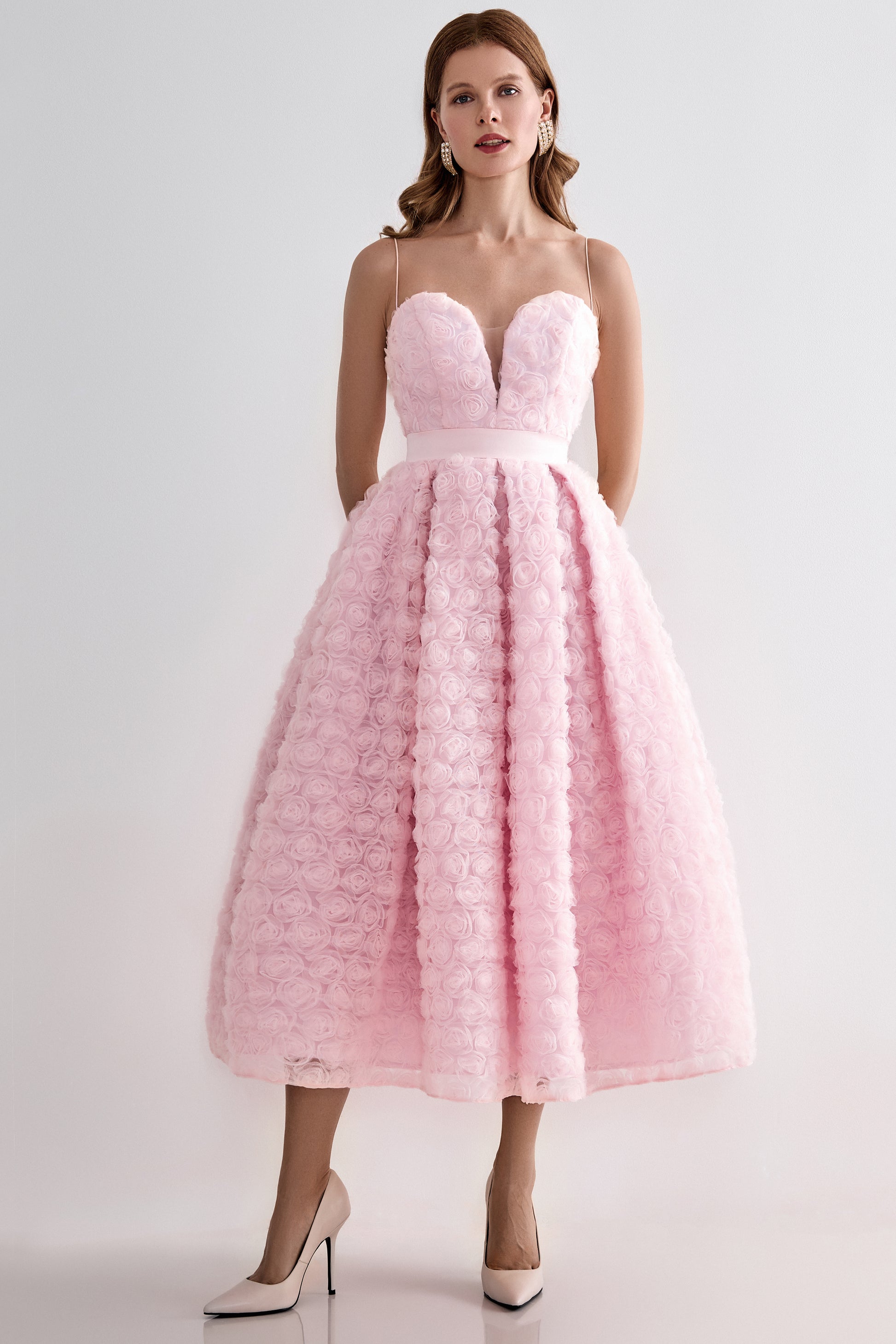 A romantic statement piece for special occasions. This corset-style midi dress features a structured bodice with a heart-shaped neckline and delicate thin straps. The voluminous skirt is adorned with textured 3D floral appliqués, creating an airy, sculptural silhouette. A perfect choice for summer soirées, bridal events, or evening celebrations.
