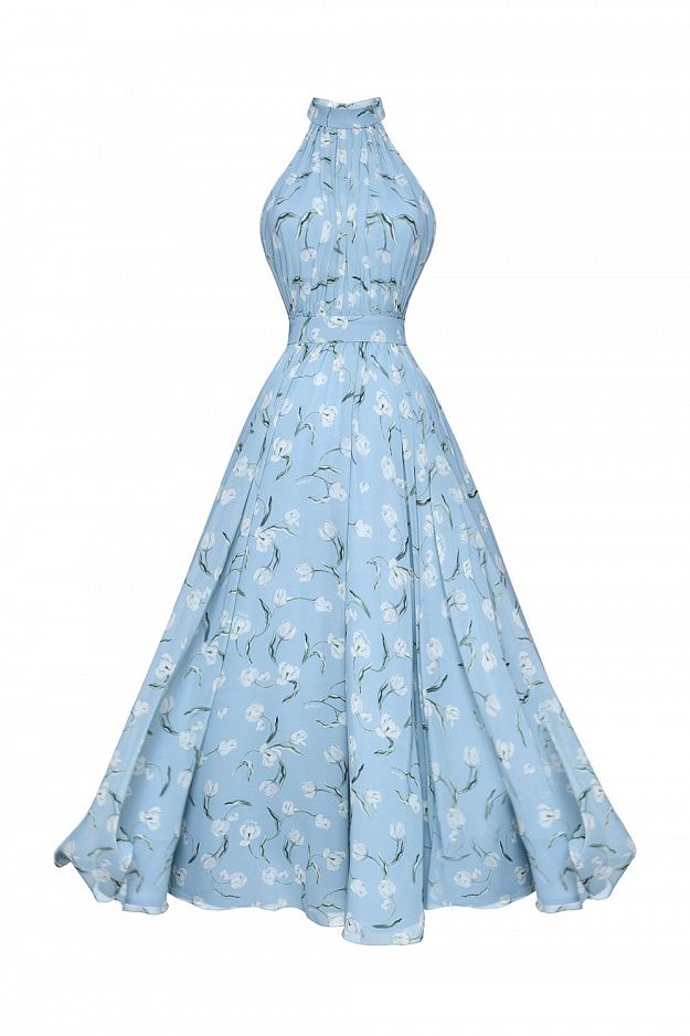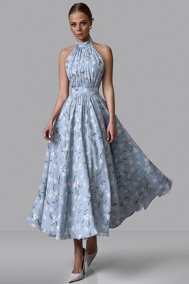 A light and airy dress featuring soft draping and an emphasis on the shoulder line. The high neckline combined with open shoulders creates a refined and modern silhouette. The fabric flows beautifully in motion, forming soft folds and enhancing the lightness of the look. The fitted waist is balanced by a flared skirt, creating an elegant and feminine shape. Perfect for special occasions, summer events and evening outings.