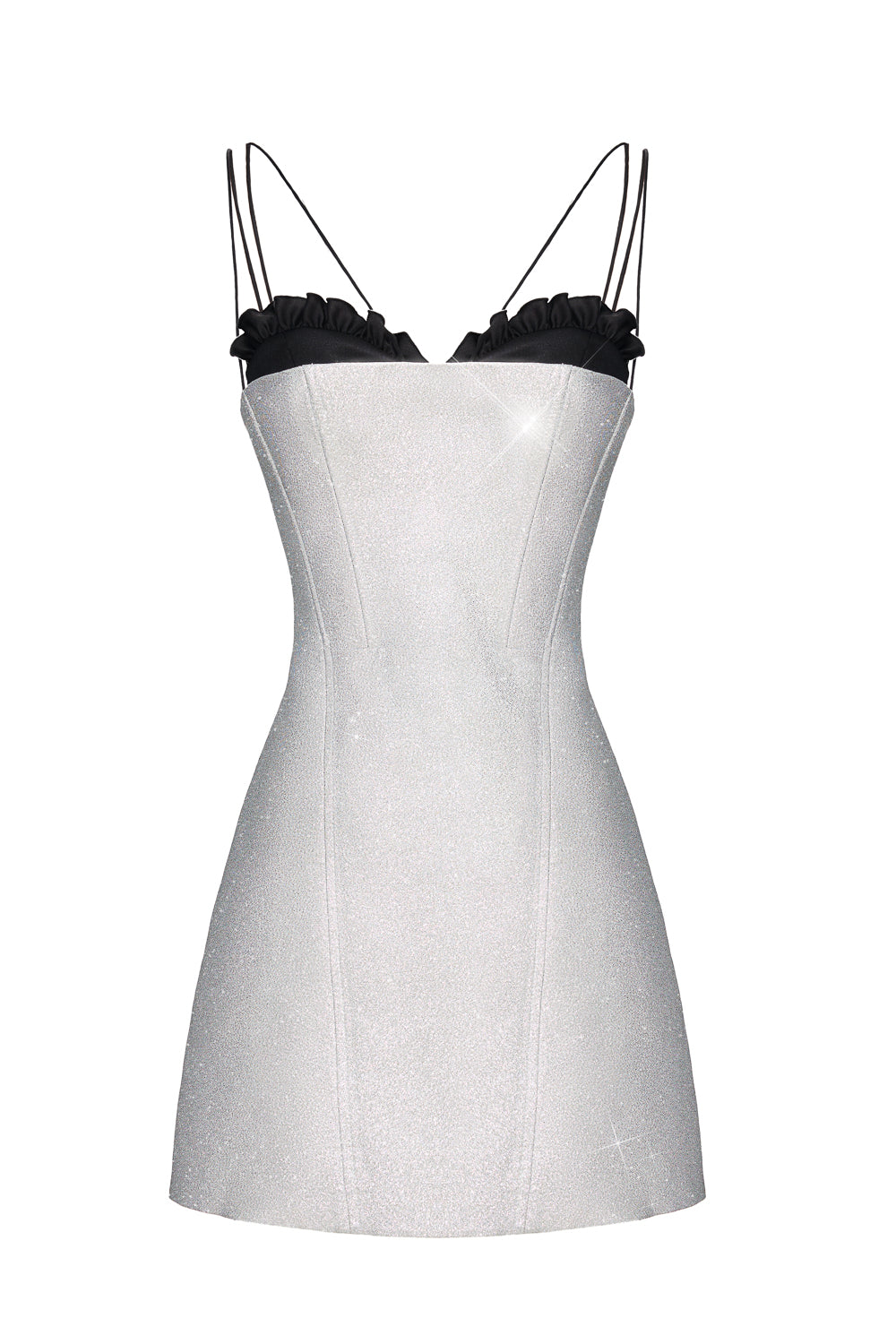 A shimmering corset mini dress with delicate shoulder straps and sheer lace trim along the neckline. Sculpted to accentuate the silhouette, it’s designed to stand out — from festive evenings to red carpet moments.