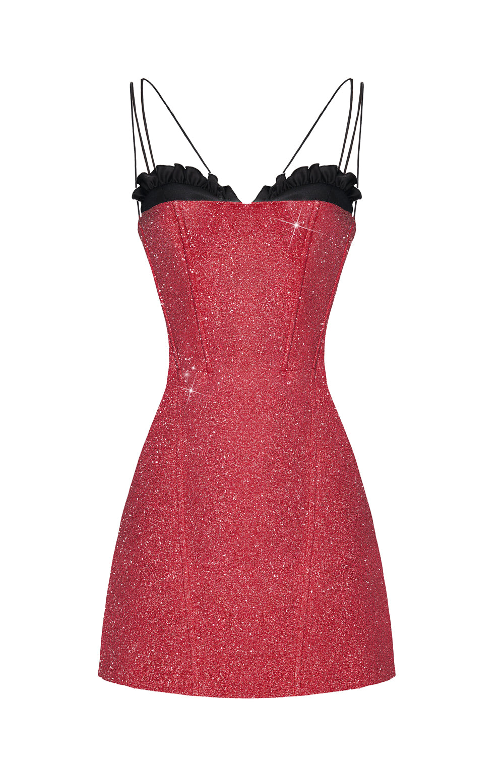 A shimmering corset mini dress with delicate shoulder straps and sheer lace trim along the neckline. Sculpted to accentuate the silhouette, it’s designed to stand out — from festive evenings to red carpet moments.
