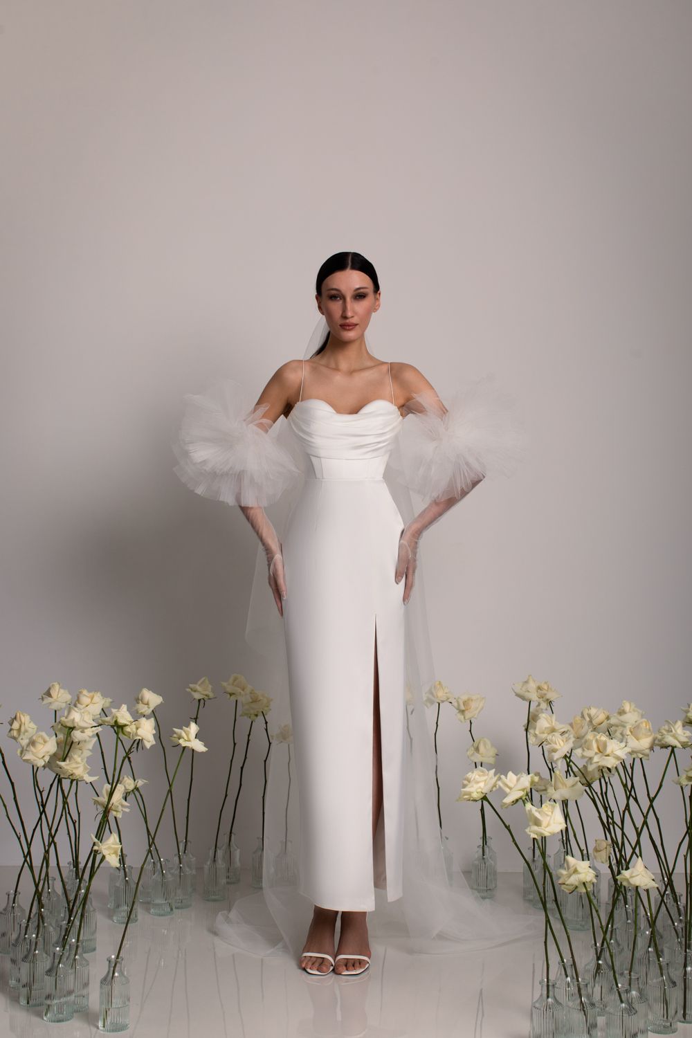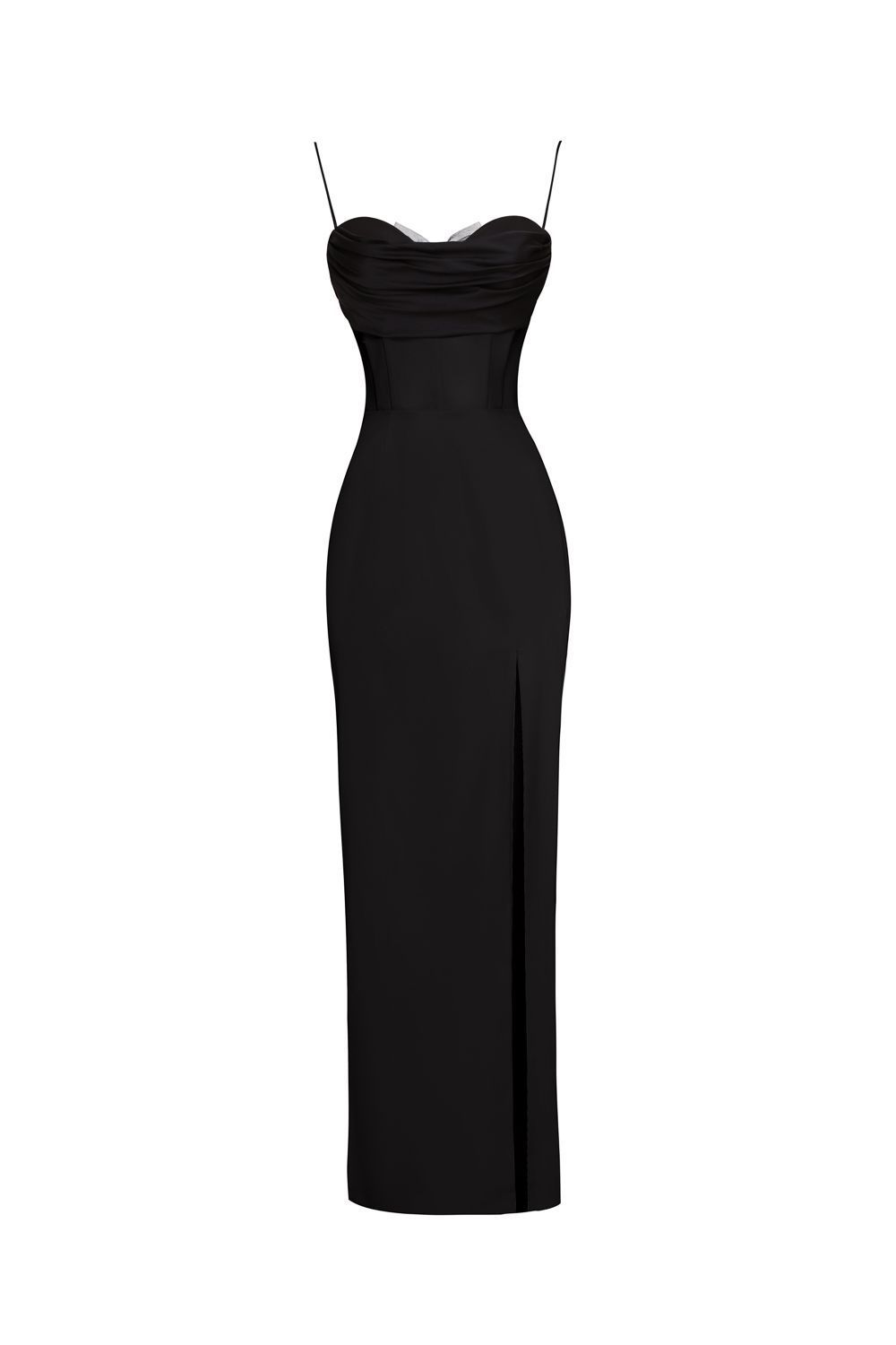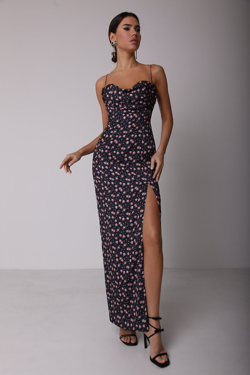 A fitted maxi dress on fine straps with a sweetheart neckline, adorned with delicate chiffon bows. The body-hugging silhouette gracefully follows your curves, while the high slit adds a sensual twist. Ideal for evening events, date nights or special occasions.