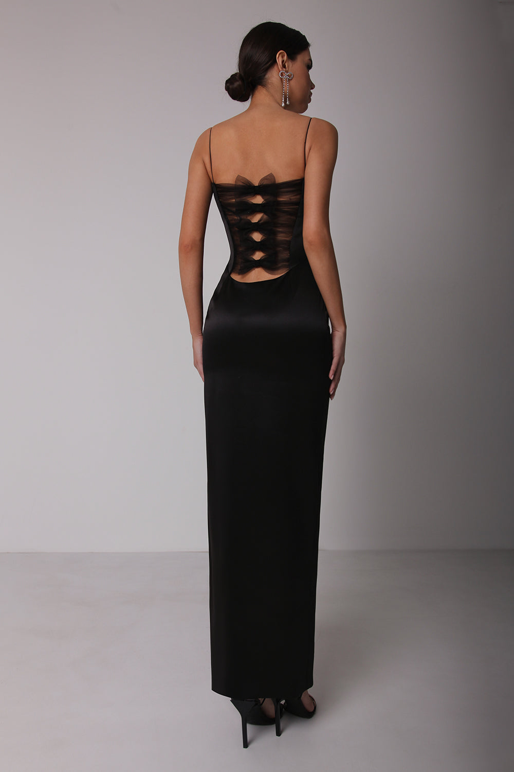 A fitted maxi dress on fine straps with a sweetheart neckline, adorned with delicate chiffon bows. The body-hugging silhouette gracefully follows your curves, while the high slit adds a sensual twist. Ideal for evening events, date nights or special occasions.