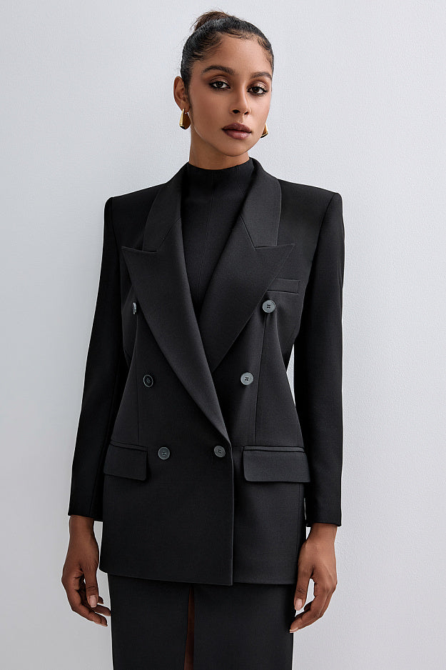 This elegant, straight-cut, double-breasted jacket is the perfect choice for modern business and evening looks. Crafted from a sturdy suiting fabric, it maintains its shape and ensures a perfect fit. Wide lapels and gold-tone buttons accentuate the look, adding sophistication and expressiveness. Ideal for the office, formal events or stylish outings on the town.