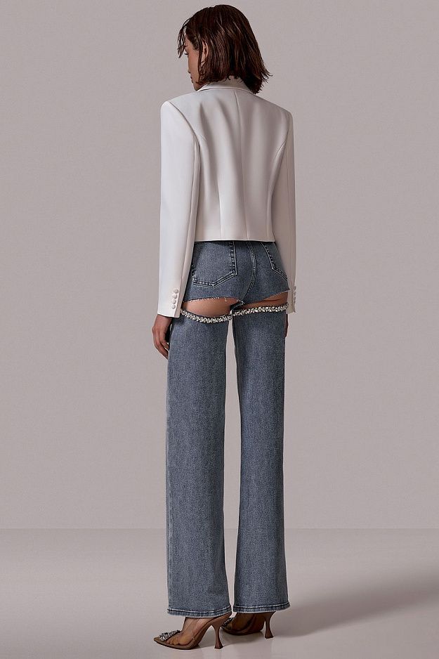 These jeans are a daring mix of everyday denim and high fashion. At the front, they feature a classic high-waisted straight-leg silhouette, while the back reveals striking cut-outs adorned with sparkling crystals. The structured denim with a subtle vintage wash, paired with raw frayed edges, creates a bold statement piece that combines elegance with edgy modernity.