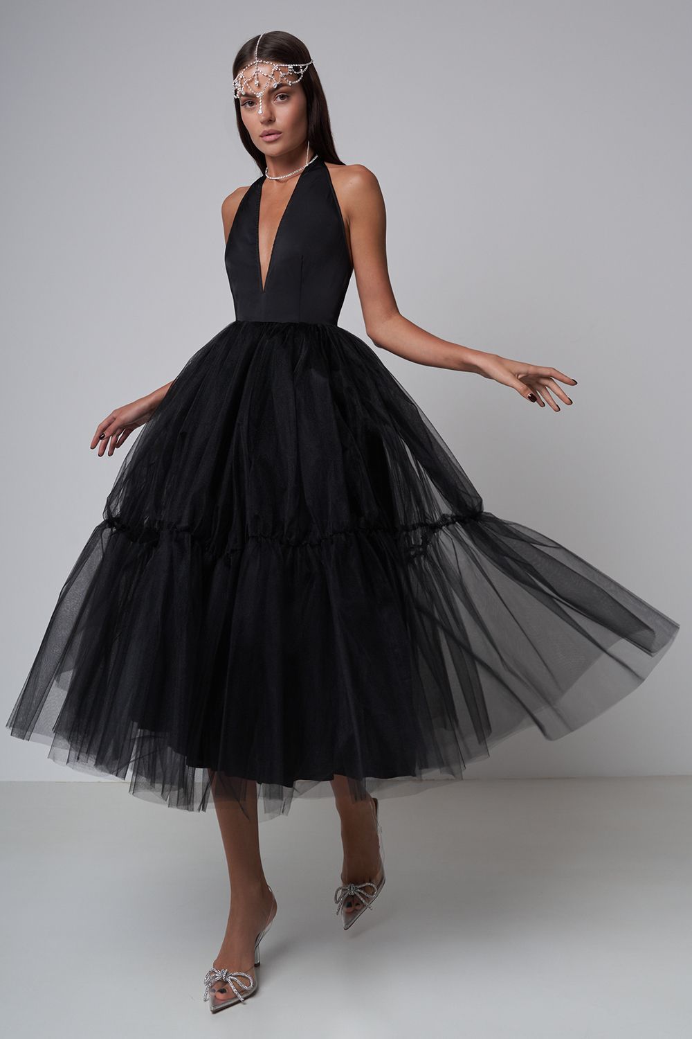 Deep v neck lush midi dress. Tiered tulle skirt, open back with  soft ribbon ties. 100% Polyester. Lining: 95% polyester, 5% elastane.