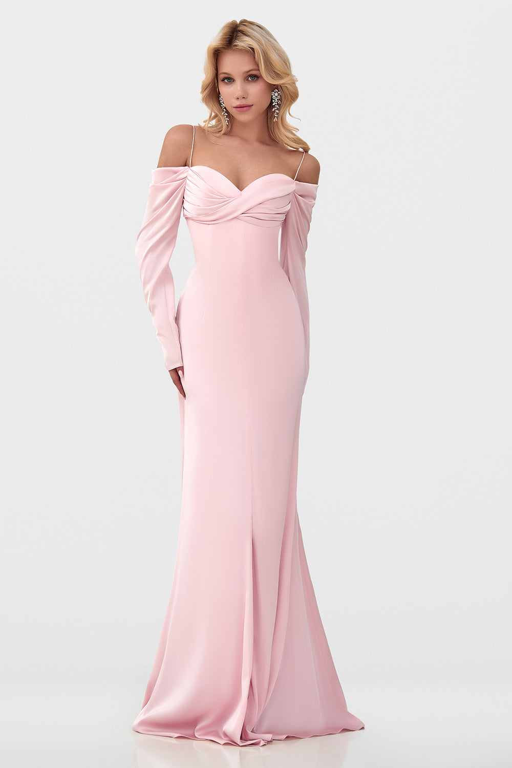 A show-stopping evening gown that exudes femininity and modern drama. This design features delicate straps paired with draped off-shoulder sleeves, creating a romantic yet architectural neckline. The fitted bodice sculpts the silhouette, flowing into a floor-length skirt that enhances elegance with every step. A daring thigh-high slit adds movement and allure, while long fluid sleeves and a detachable scarf detail introduce a sense of theatrical sophistication. Perfect for gala evenings, red carpet moments, or statement occasions.