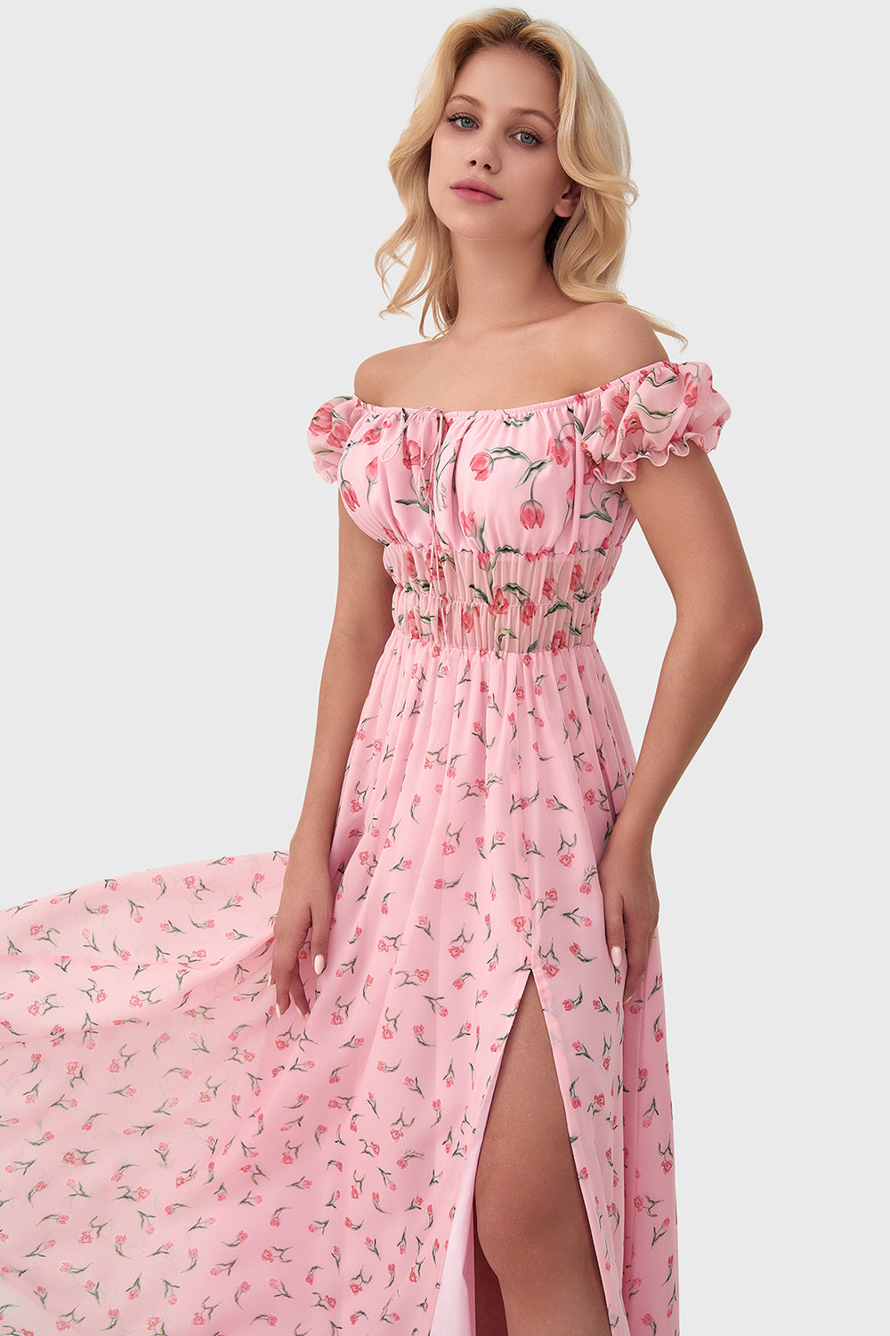 This off-shoulder floral maxi dress features soft ruffles, a gathered bodice under the bust, and a high slit that adds graceful movement. Designed in a delicate pastel floral print, it highlights the waist and creates a flowing, feminine silhouette.