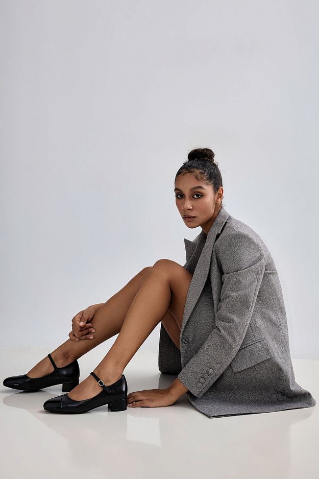 Classic low-heeled shoes with a strap, crafted from two types of genuine leather, are perfect for everyday wear with a variety of looks.
