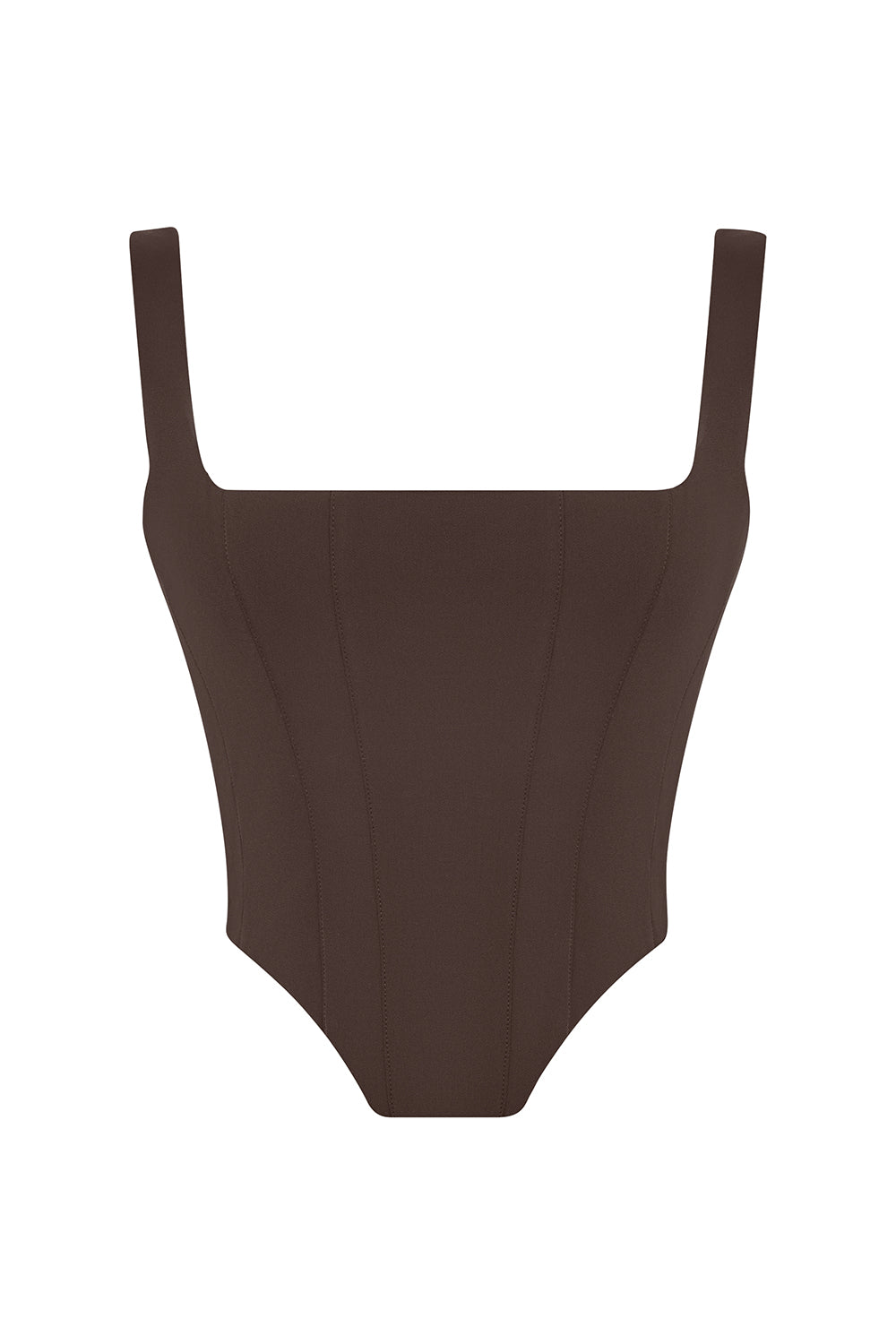This corset features wide straps and a square neckline. The fitted silhouette with a shaped hem accentuates the waist and highlights the bust. Stiff vertical darts create a defined silhouette, while the dense fabric maintains its shape, ensuring a perfect fit.