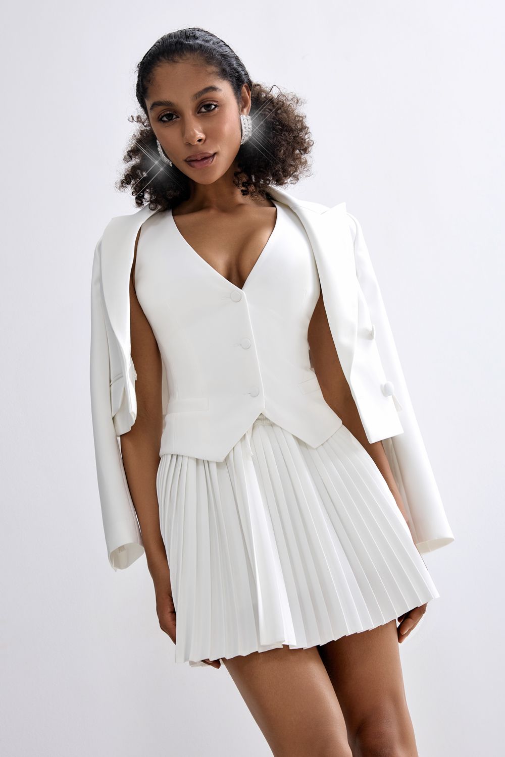 The fitted vest of the classic cut on buttons. Composition: 63% of viscose, 32% polyester, 5% elastan. Lining: 95% polyester, 5% elastan.